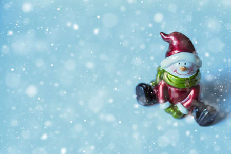 Snowman in Santa Claus christmas red hat sitting on blue snowy background.