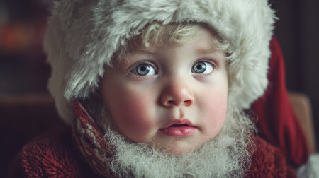 A young child wearing a fluffy holiday hat gazes with wonder capturing the enchanting spirit of New Year celebrations.