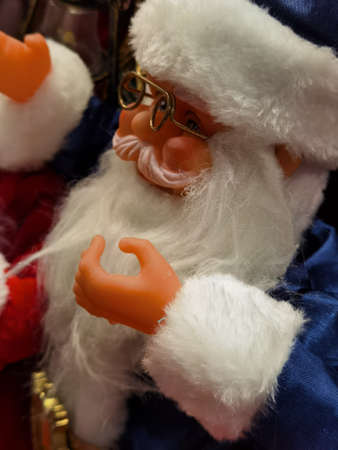 Portrait of toy santa claus with white beard in bright red suit and hat