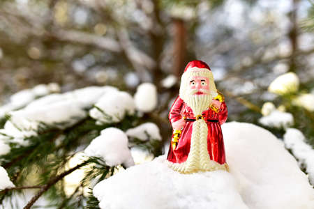 Christmas toy Santa Claus on branch with pine tree needles in the snow. Christmas balls decoration. Сoncept of preparing for the celebration of New Year and Shopping gifts.