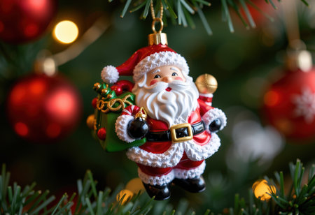 Christmas tree with Santa Claus toy on blurred bokeh background.