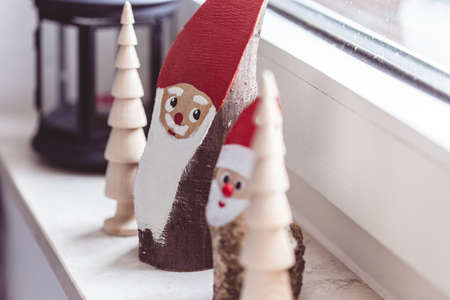 A beautiful shot of a Christmas decoration of wooden Santa and Christmas tree near the window