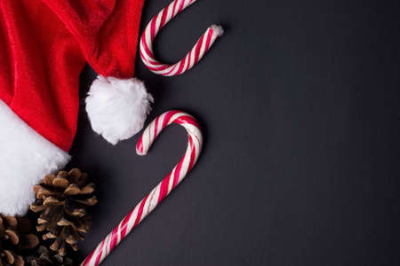 Red Father Christmas hats isolated on black background, top view, close up. Santa's hat with space for text. New year concept.