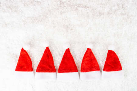 wide panorama row of red white plush santa claus christmas xmas hat on snow in front of silver gray bokeh lights background