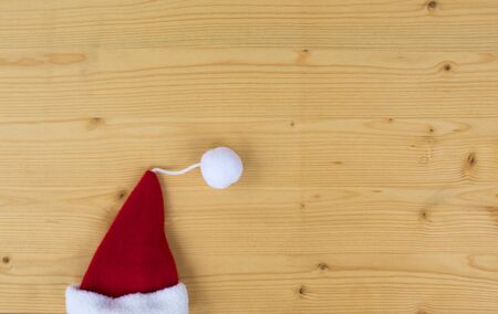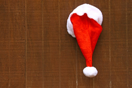 Iimage of Santa's hat hanging on a wooden backdrop with copy space.