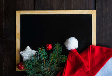 Red Santa Claus cap on dark wooden background. Christmas/New Year concept.