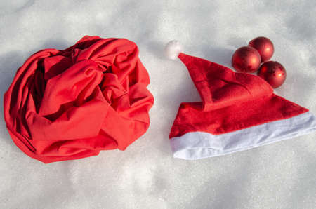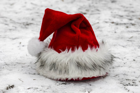 Red Santa Claus hat stand on white background. Christmas and New Year lifestyle concept. Sunny day.
