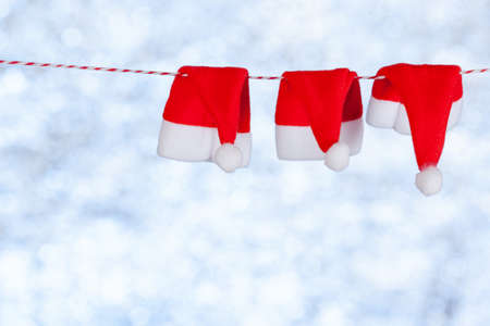Three red little Christmas hats hang from a rope against a blurred shiny blue-gray background. Copy space, concept