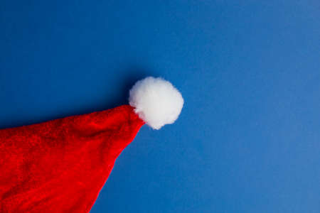 Simply minimal design Christmas Santa Claus hat isolated on blue pastel colorful trendy background. Christmas New Year december time for celebration concept. Flat lay top view copy space