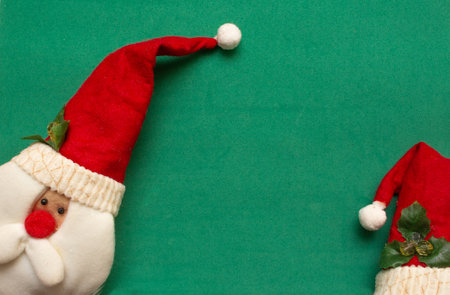 Christmas card two red Santa Claus's hat with white pompon green backdrop.