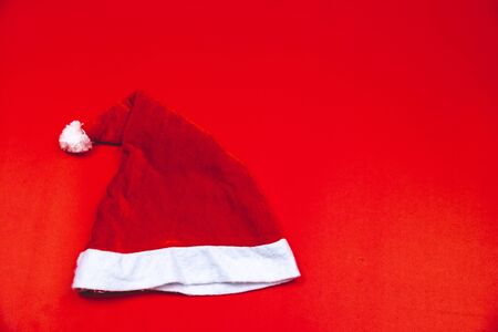 Minimalistic concept of Christmas. Red Santa Claus hat on a red background. Christmas background. flat lay, top view, copy space.