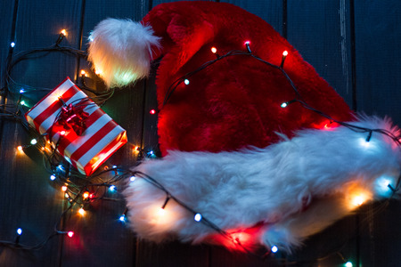 Santa claus hat, fir tree branch with decoration, gift boxes With bright bulbs flashlights garland on a black background New year and Christmas background