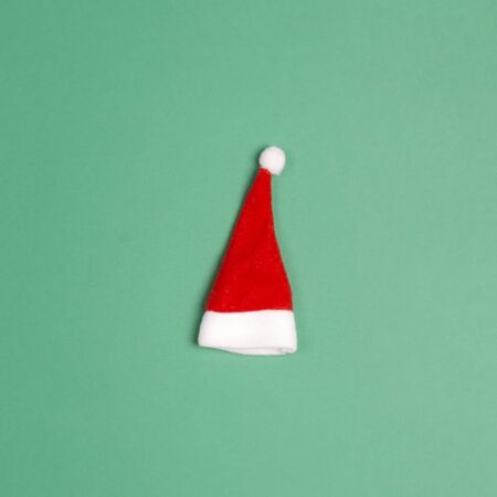 Festive Christmas Decoration With Red Santa Hats on a Green Background. Christmas Minimalist Background. Santa Claus Hat on a Green Background. Happy New Year and Merry Christmas.