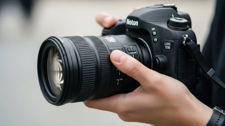 Close up of photographer hands holding DSLR camera. Focus on lens.