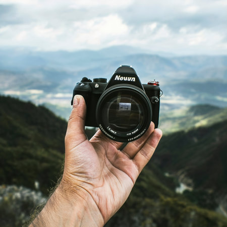 Young adult in shirt holding a camera for landscape photography. Travel concept