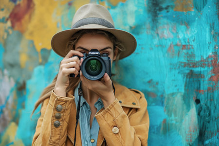 Photographer professional camera hand shot paparazzi media film, technology model focus dynamic pose, colorful joyful happy sunny pretty beautiful device