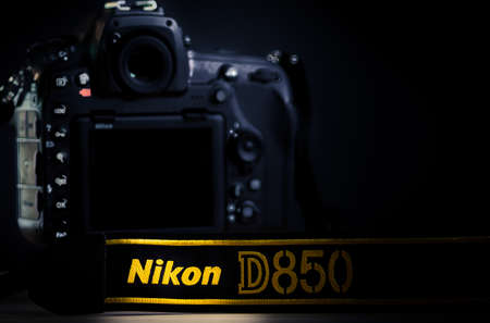 Sri Lanka - 02 17 2021: Modern professional level DSLR body and neck trap with Nikon brand name embraided on a wooden table, Nikon D850 close up photograph.