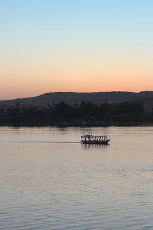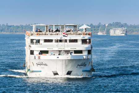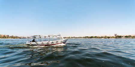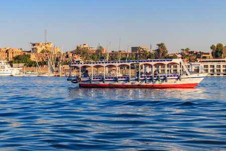 Luxor, Egypt - December 11, 2018: Tourist boat sailing on the Nile river in Luxor, Egypt