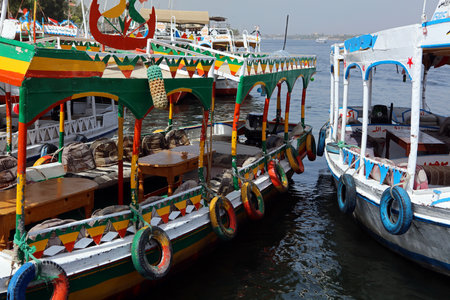 Colorful boats in the port, Landscape on Nile river in Luxor, Egypt