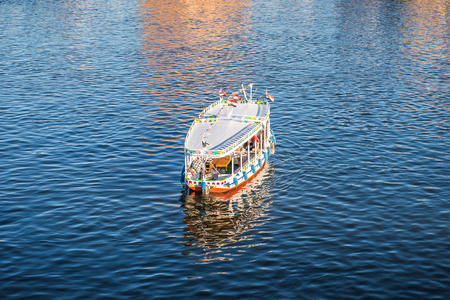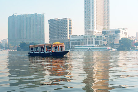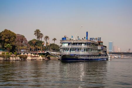 Cairo, Egypt - December 8, 2018: Pleasure boat on sailing down the Nile river in Cairo, Egypt