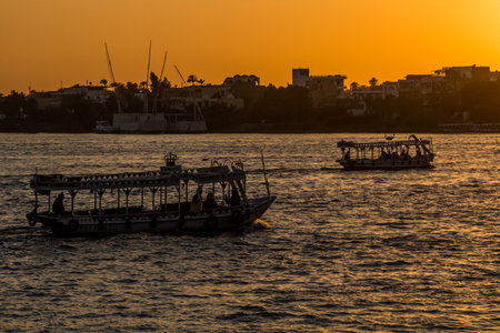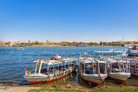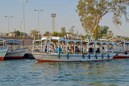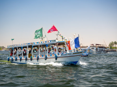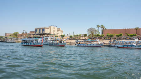 Luxor, Egypt - April 11, 2021: Tourists crossing the Nile in Luxor by boats. Traveling in Egypt.