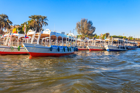 Tourist boats moored near the shore of Nile river in Luxor, Egypt
