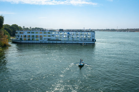 Esna Lock of The Nil, Egypt - January 17, 2025: A vibrant scene of a vendor rowing a small boat toward a large cruise ship on the Nile River under a clear blue sky.