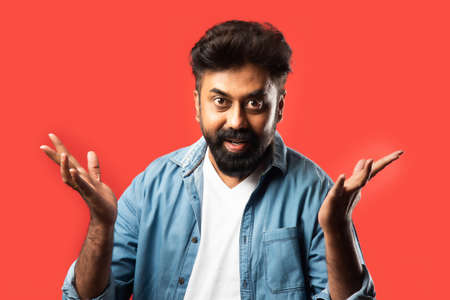 Indian asian bearded man with surprised or wow looks, standing isolated against red background