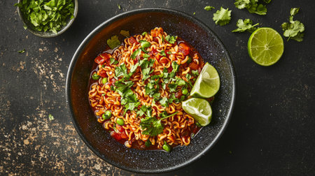 A vibrant bowl of spicy noodles garnished with fresh cilantro and lime slices, perfect for conveying flavors of a delicious homemade meal or a restaurant specialty.