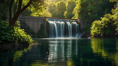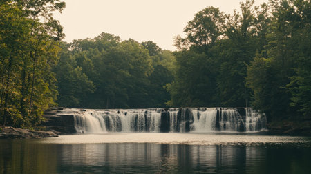 A breathtaking view of a waterfall flowing gently over rocks in a tranquil setting. Surrounding lush trees offer a sense of calm, while the lake reflects nature's beauty.