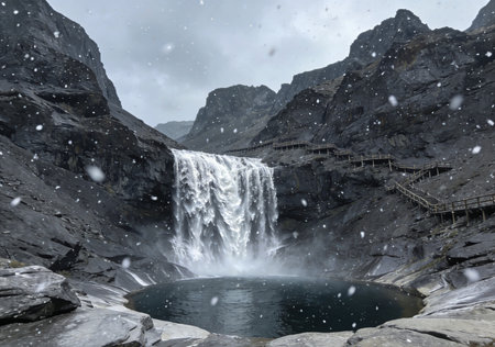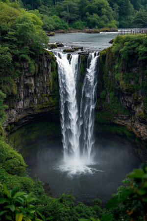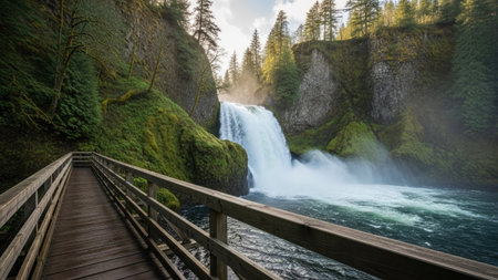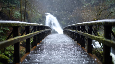 Experience the captivating beauty of a waterfall shrouded in mist, with a bridge creating a seamless connection to nature's serene and tranquil atmosphere.
