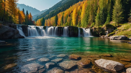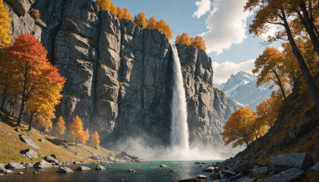 A majestic waterfall cascades down a rocky cliff face, surrounded by autumn foliage