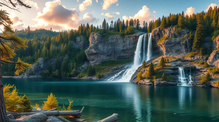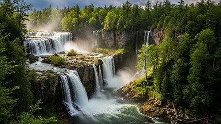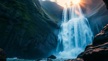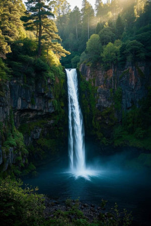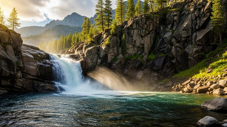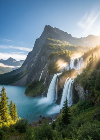 AI-generated Majestic cascading waterfalls plunge into a turquoise alpine lake surrounded by steep, pine-covered cliffs and mountains, dramatically illuminated by sun rays breaking through the mist in remote wilderness.