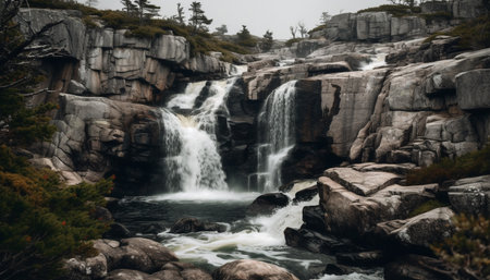 Tranquil scene of a waterfall flowing over rocky cliff in forest generated by artificial intelligence
