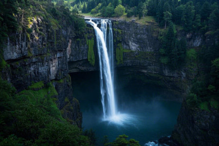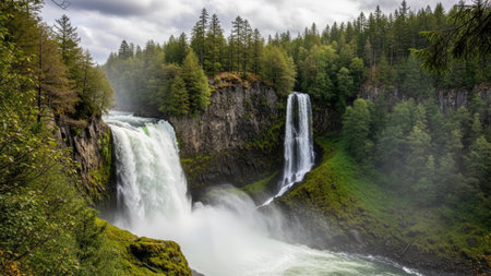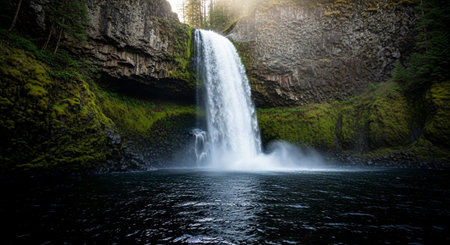 the photo captures the majestic falls of the oregon coast, showcasing its ominous vibe and breathtaking beauty. with a focus on atmospheric portraits, this uhd image highlights the mountainous vistas and nature-inspired installations. the play of transparency and opacity adds a touch of mystery, creating a romantic goth aesthetic. ai generated