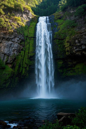A powerful waterfall plunges into a pool, surrounded by tall trees and lush greenery. The scene is illuminated by bright sunlight, casting shadows and creating a sense of depth. The image displays a natural landscape with a dynamic composition, ideal for environmental themes and commercial projects.