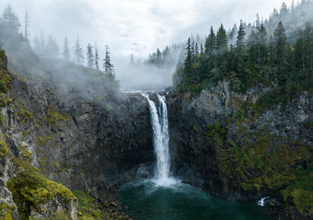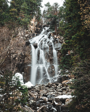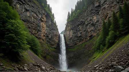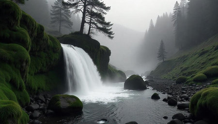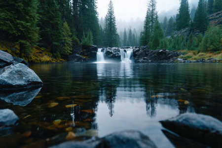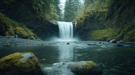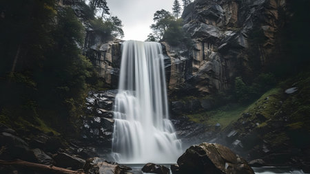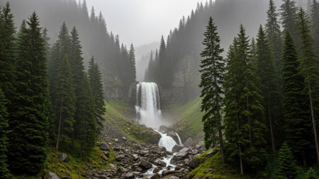 A powerful waterfall plunges into a rocky stream, surrounded by a lush forest of tall evergreen trees. The image showcases a natural outdoor environment with muted tones and soft lighting. This scene could be utilized for various commercial and editorial projects requiring scenic imagery or environmental themes.