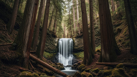 A forest scene presents a cascading waterfall surrounded by tall trees. The composition utilizes a naturalistic style with muted greens and browns. The lighting suggests an overcast day, emphasizing the textures of the water and the bark. The image is suitable for various commercial uses related to nature and landscape.