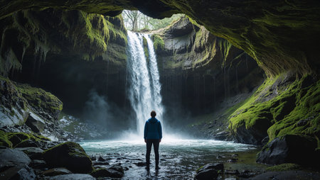 Hiker admiring powerful waterfall cascading into rocky pool inside cave covered with moss. Ai generated image
