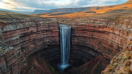 Experience the breathtaking beauty of a waterfall cascading into a deep canyon, framed by rocky cliffs and lush greenery under a vibrant sunset sky, perfect for nature lovers.