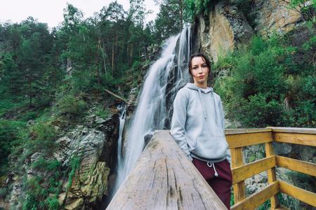 The girl at the waterfall. A girl stands on the edge of the observation deck at a waterfall in the forest on a rainy day.