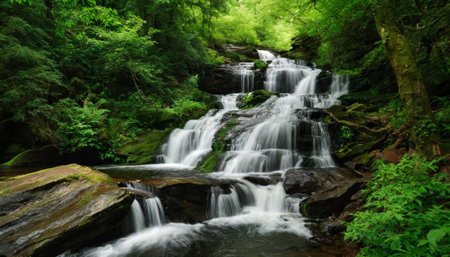 Tranquil and serene waterfall in the lush green forest surrounded by vibrant foliage and mossy rocks