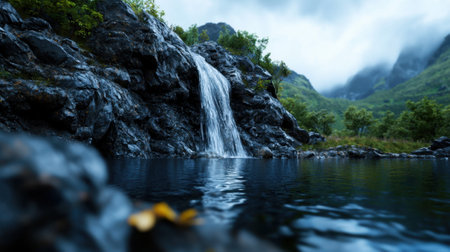 the waterfall, composed of rocks at a lower level and a cliff, showcases a dark and moody landscape. this stunning image captures the essence of scottish landscapes, with its high resolution and smooth, shiny appearance. it is a photographic source that exudes a sense of tranquility and beauty. ai generated
