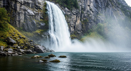 A breathtaking view of a powerful waterfall cascading down rugged mountain rocks, enveloped in mist, showcasing the vibrant blue waters of a pristine natural landscape.