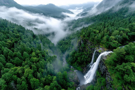 A waterfall cascades down a cliff into a misty valley surrounded by lush green forest
