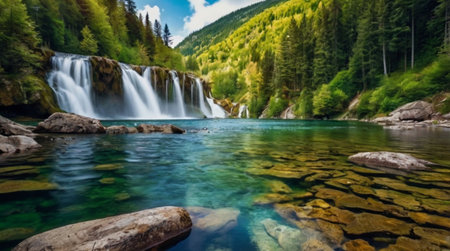 A breathtaking view of a serene waterfall cascading into a clear blue pool, surrounded by lush green forest and rocky terrain, evoking peace and tranquility.