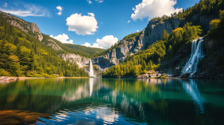 AI Generated. Majestic Waterfall Cascading Down Cliffs into a Lush Valley