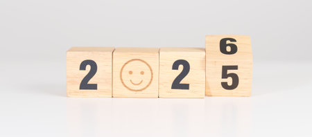 2025 end year to Happy New Year 2026 with Smile block. Satisfaction, feedback, Review, mental health, eco sustainable and good year concept
