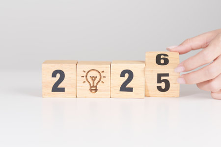 2025 year change to 2026 year block with lightbulb. Business Idea, Creative, Thinking, brainstorm, Goal, Resolution, strategy, plan, Action, change and New Year start concepts