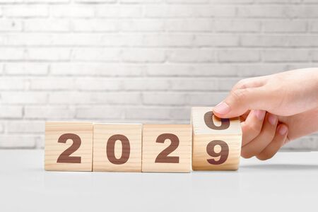 New year 2019 change to 2020 concept hand change wooden cubes.